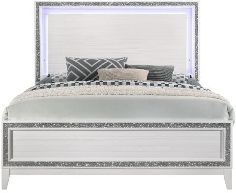 Classic design with touches of modern aspects makes this Haiden Collection ideal for any bedroom. The bed offers a cream fabric padded headboard with LED light. It also features a glamorous shimmering silver accent trim that adds richness to design. The white finish makes it easy to fit into already existing decor.Read More