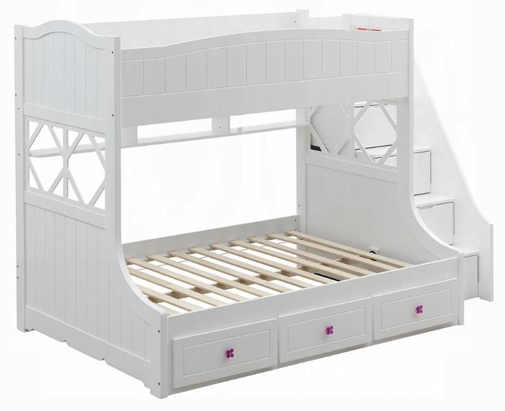 Knockdown, twin over full bunk includes 3 drawers, bookshelf and side storage ladder