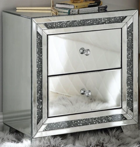 Mirrored finish with faux diamonds and clear glass, mirrored tapered legs