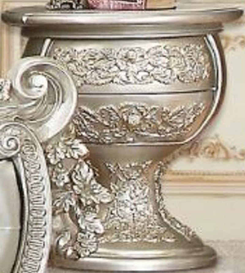 A luxurious antique silver finish with hand-brushed gold accents makes up the Sandoval nightstand. Surrounded by fine Rococo scrolls and floral ornament crowns with stylized ribbons. Featuring two convenient storage drawers and a single pedestal base for a modern appeal. The table top has enough room for a lamp, books, and a carafe.Read More