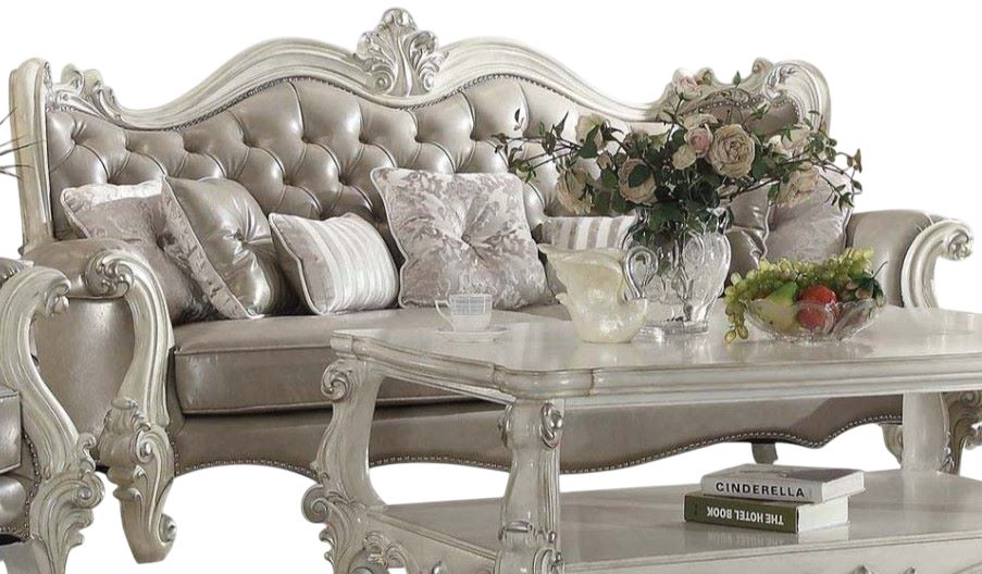 The Versailles Sofa showcases grandeur with its oversized scrolled trim, vintage hand-brushed detailing, and nailhead accents on the crown backrest, armrests, and legs. Complete with a padded scrolled base and seven plush pillows, this sofa blends opulent design with luxurious comfort, perfect for elegant interiors.Read More