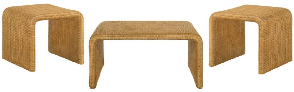 Mid-century modern coffee table set with natural woven rattan design
