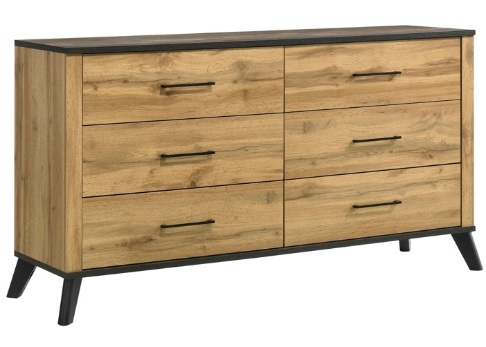 Add a touch of elegance to your bedroom with this spacious dresser, combining mid-century modern design with a rustic wood grain effect. The weathered brown and natural pine finish is beautifully complemented by matte black finished metal pull handles. Crafted from engineered 3D paper veneer and featuring English dovetail drawer joinery, this dresser offers durability and style. The center metal drawer glides ensure smooth operation, while the ample storage space keeps your essentials organized and easily accessible.Read More