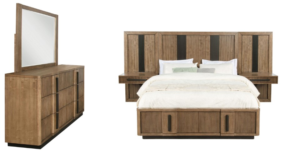 Includes: One (1) California king bed, two (2) wall panel, one (1) dresser, and one (1) mirror