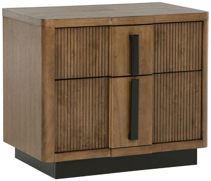 Introduce a decorative touch and plenty of convenience with a modern two-drawer nightstand. Crafted in wood, it receives a cool ash-brown wood grain finish with distinctive dark drawer pulls and a matching recessed base. The drawers offer ample storage at your bedside.Read More