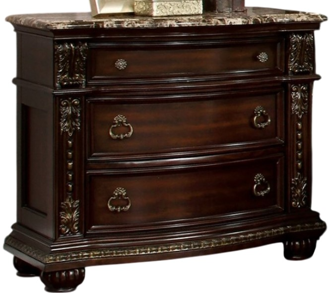 The Furniture of America® Fromberg Brown Cherry 3-Drawer Nightstand showcases a luxurious brown cherry finish, offering both style and functionality. With three spacious drawers, it provides convenient storage for bedside essentials, while its elegant design enhances the overall look of any bedroom.Read More