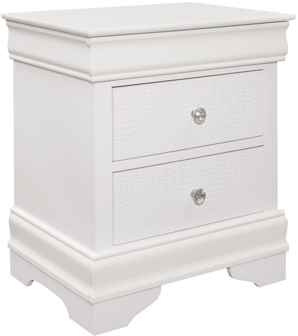 The unexpected intersection of traditional design and glamorous styling creates the dynamic look of the Lana collection. A white finish is utilized to enhance the faux alligator embossed drawer fronts of the nightstand with crystal faceted knob hardware lending an additional fabulous touch.Read More