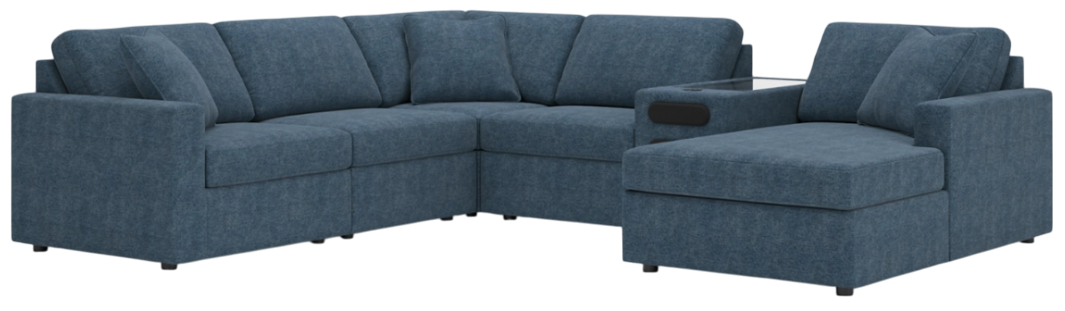 Includes 6 Modular Pieces: Left-arm facing corner chair, audio console with storage, 2 armless chairs, wedge and right-arm facing corner chaise